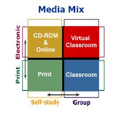 This graphic illustrates a composition of media elements (CD-ROM, Online, Virtual Classroom, Print and Classroom) used in a blended learning approach to engage both self-study and group interaction.